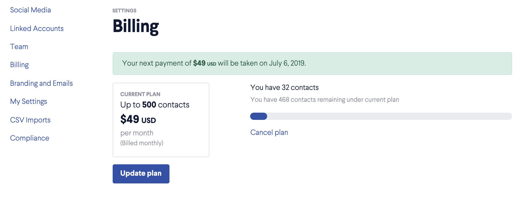 To update your credit card details, go to Settings then Billing and click on the Update Plan button.