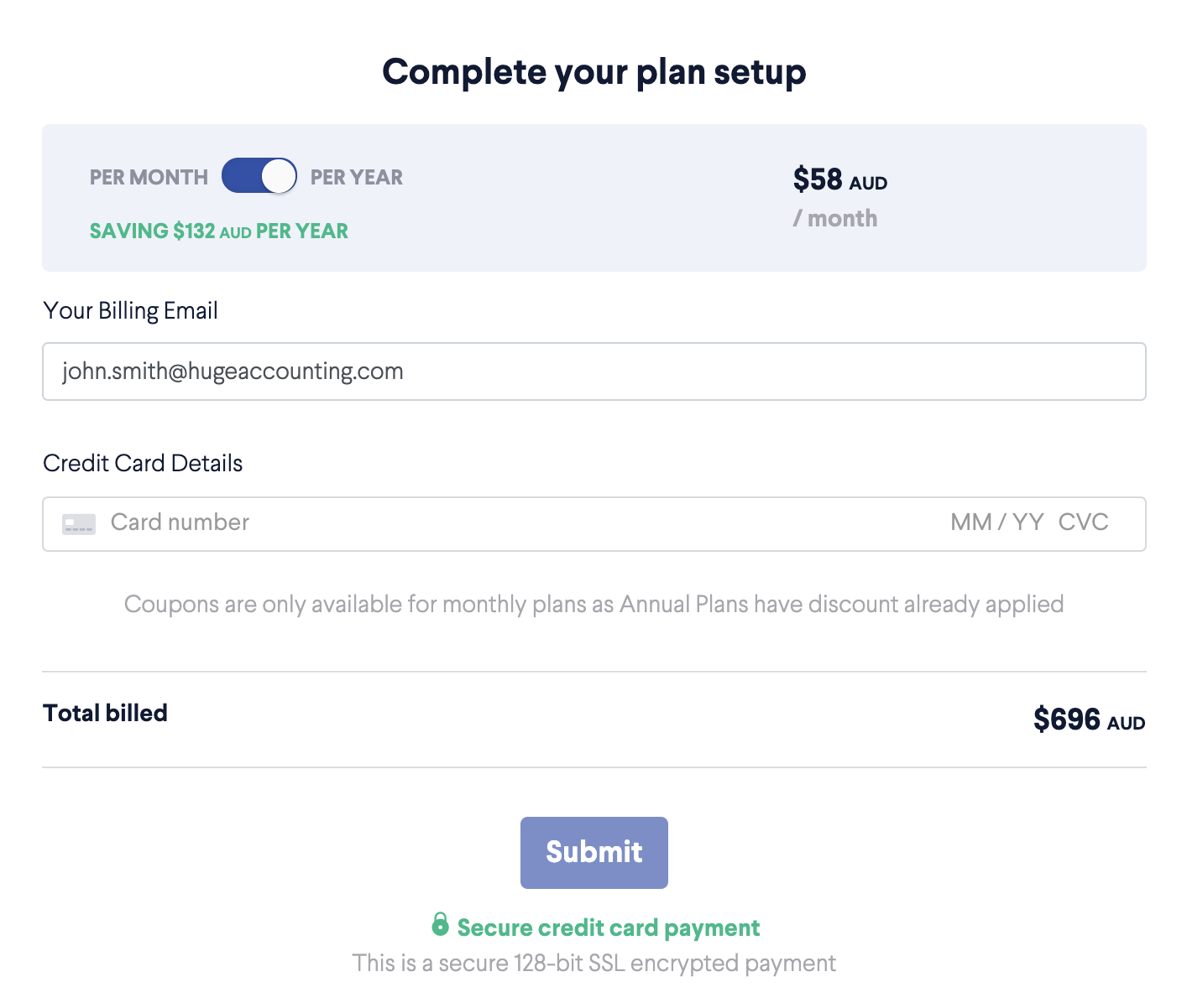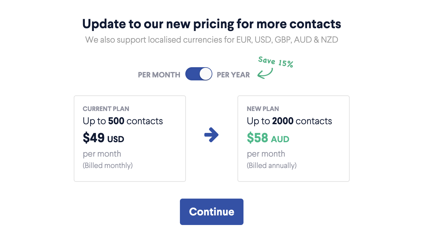 You'll be presented with a box that contains a small button that can be switched between 'Per Month' and 'Per Year'. if you're currently on a monthly plan, you can update that to an annual plan you will save 15%.